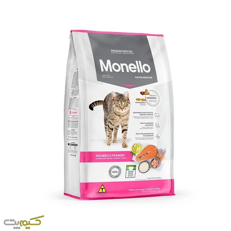 غذای گربه بالغ با میکس سالمون و ماهی تن مونلو برای تمامی نژادها قابل استفاده است و حاوی امگا 3و 6 و انواع ویتامین ها و مواد معدنی است