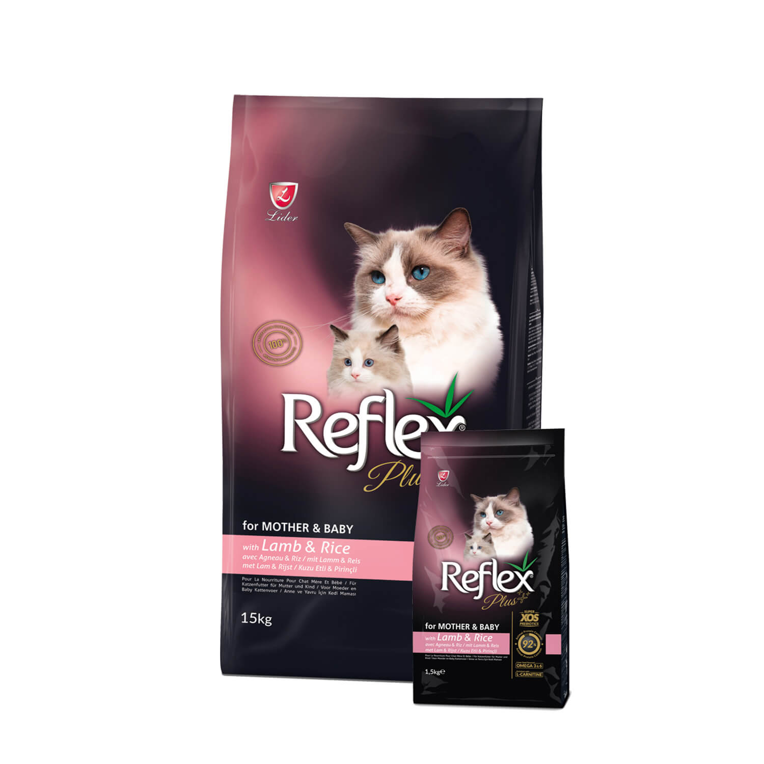 غذای مادر و بچه گربه رفلکس پلاس یک خوراک کامل است که با طعم بره و برنج تهیه شده است. این محصول تمامی نیازهای غذایی این حیوانات را رفع می کند.